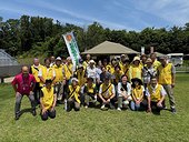 当日は、晴天。活動場所は芝生広場。集合時間9時、汗びっしょりとなりながらのテント張り、10時から 500組の広報資料の配布開始です。黄色いベストを着て「社明の広報活動です」と声をかける私たちを見て少し戸惑いながら広報資料を受け取る来場者もいました。なかなか進まない広報資料の配布に不安でしたが、午後になると来場者が多くなり、14時半には無事終了となりました。